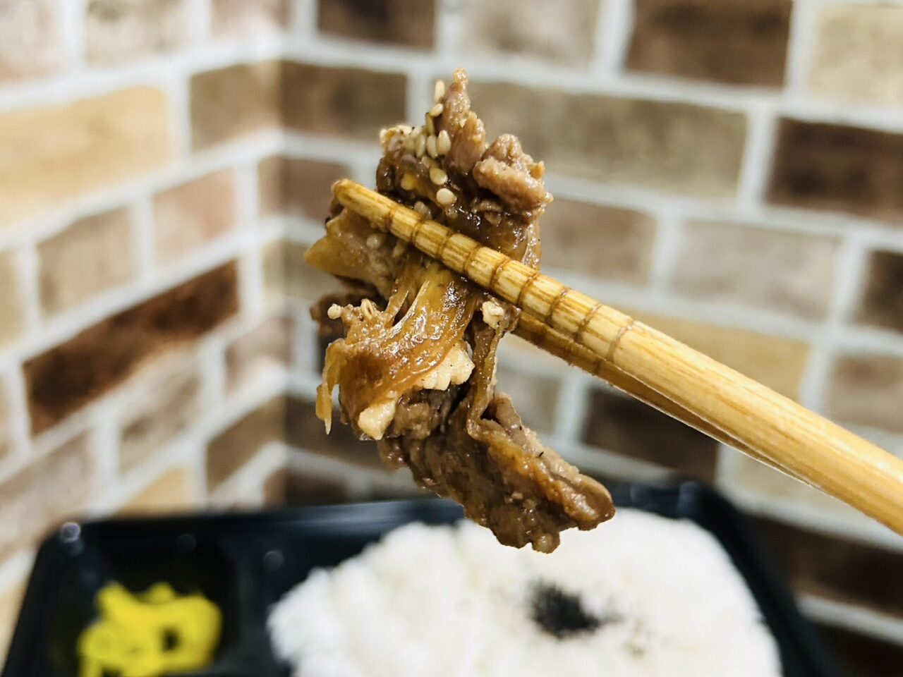焼肉弁当と1個100円のからあげ2個。これでしめて税込み590円。いまどき信じられないお値段です!