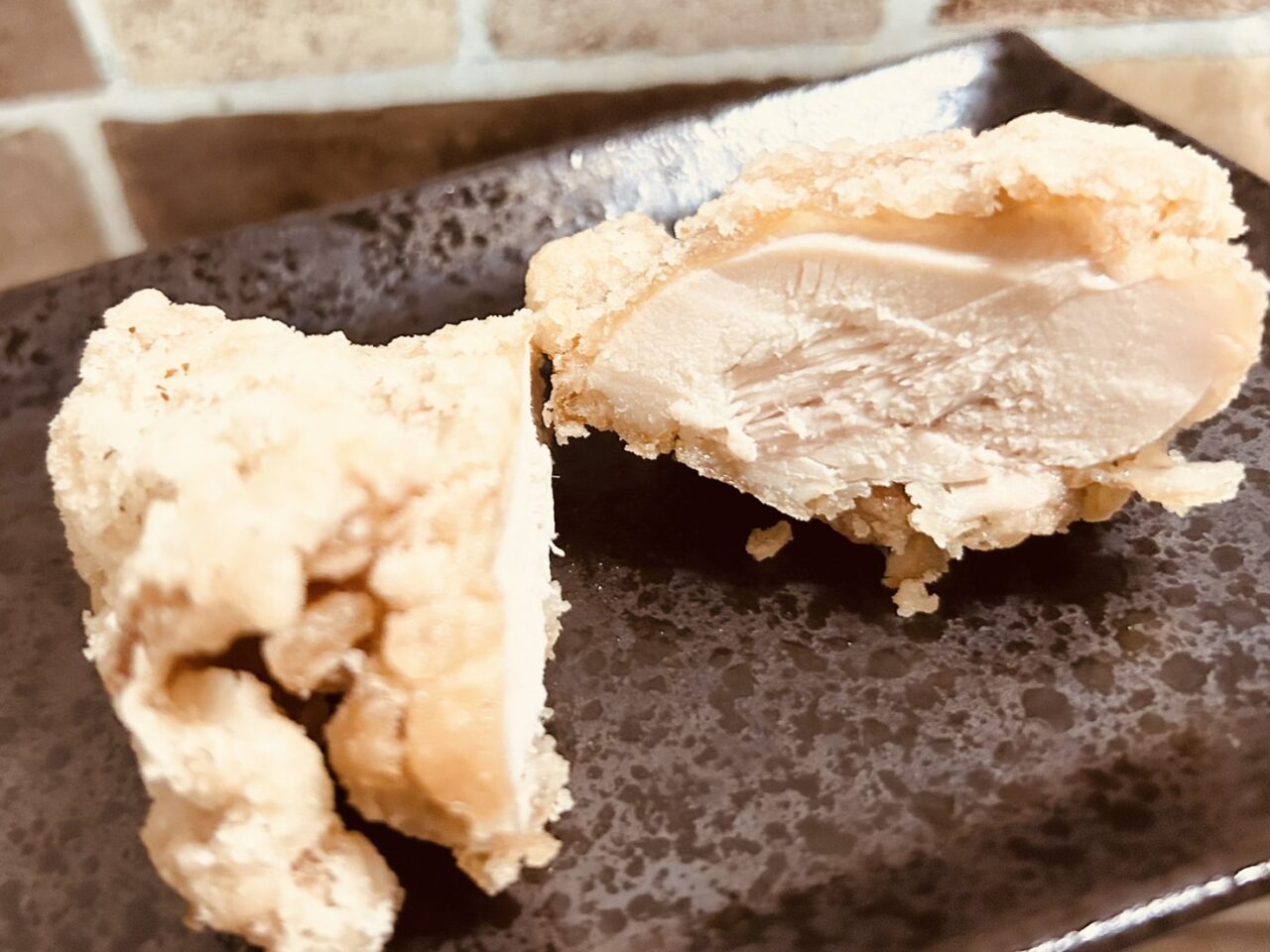 半分に割ってみましたが、それでも一口ではとても無理な大きさ。あえて温めずにいただくと、衣はカリっ、お肉はしっとり柔らかく、ジューシーです♪