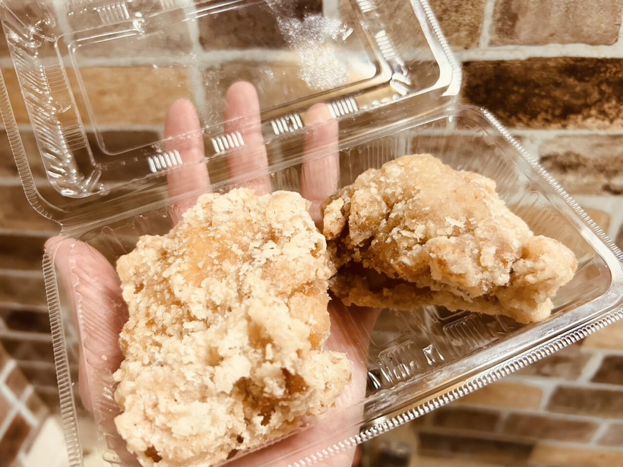 特大のからあげは手のひらに余るサイズ。コンビニのからあげもちょっとずつサイズダウンしていく中、この大きさは驚きです。