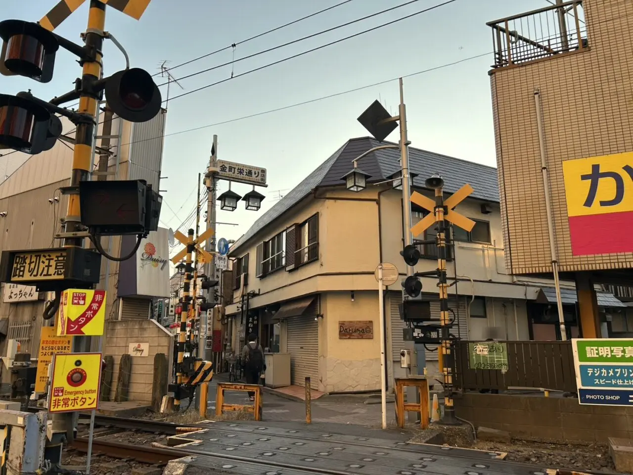 踏切の向こうに見えるのは、金町栄通り。もはや葛飾区にも少なくなってしまった、センベロの町のひとつですよね。