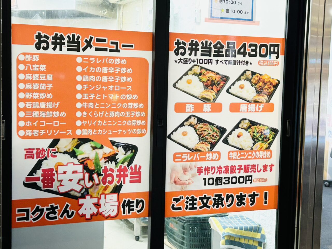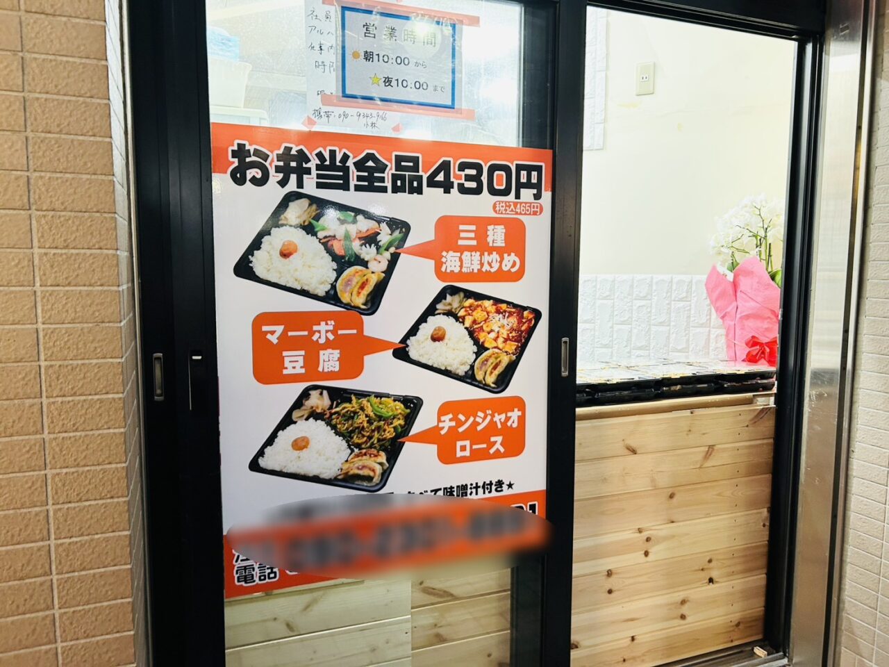 ガラス戸には、「お弁当全品430円(税込み465円)」の表示と、お弁当メニューが出ています。