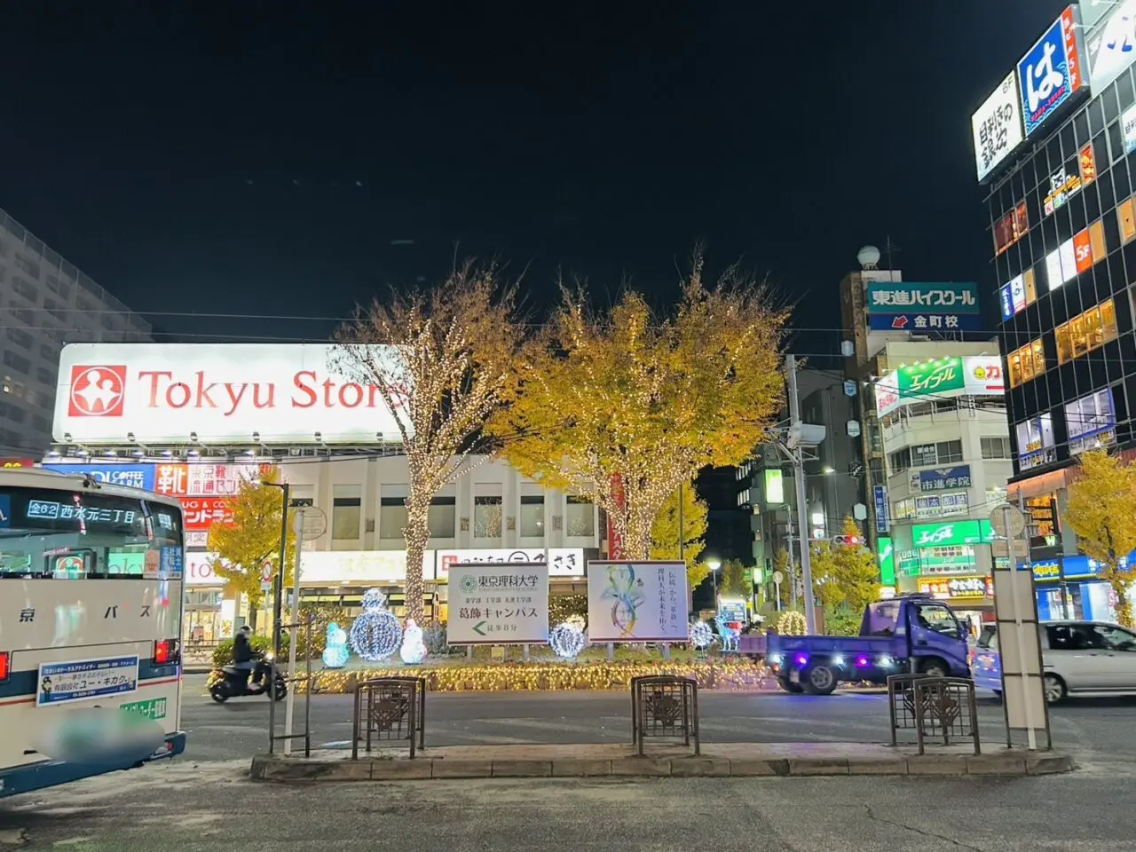 もちろん南口側と、それから少し足を延ばして、東京理科大葛飾キャンパス前にもイルミネーションが輝く金町。もちろん、追いかけていきますよ。