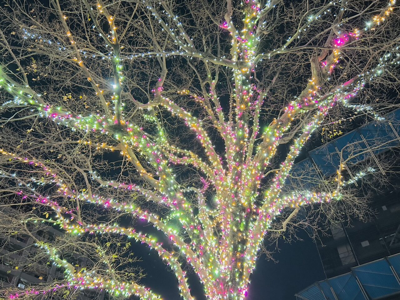 このシンボルツリーも、毎年キラキラにドレスアップするんですよね。今回はなんだか、とってもカラフルじゃありませんか?
