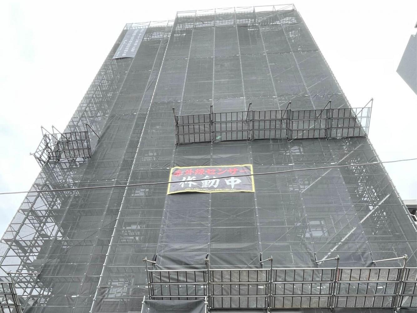 足場には赤外線センサーを設置。夜間工事を行わない間の安全を守ります。防犯カメラ設置・・・そんな注意書きが増えましたが、防犯カメラがあっても増えた近年の闇バイトによる住居侵入事件。夜間、マスクをつけられたら防犯カメラでは心配です。赤外線センサーであれば悪意のある侵入者が、気づかない間に通報ができます。また、弊社では工事に関わるスタッフの服装やマークを統一する事で、工事業者を装ったスタッフの侵入にも気を付けてます。