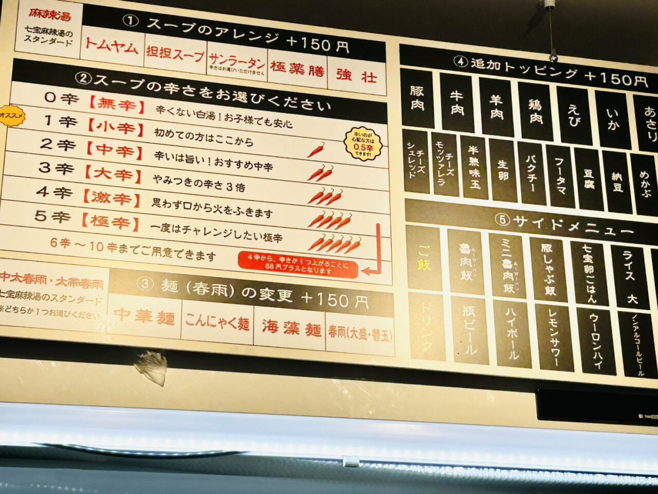 「七宝麻辣湯」店内のメニュー看板