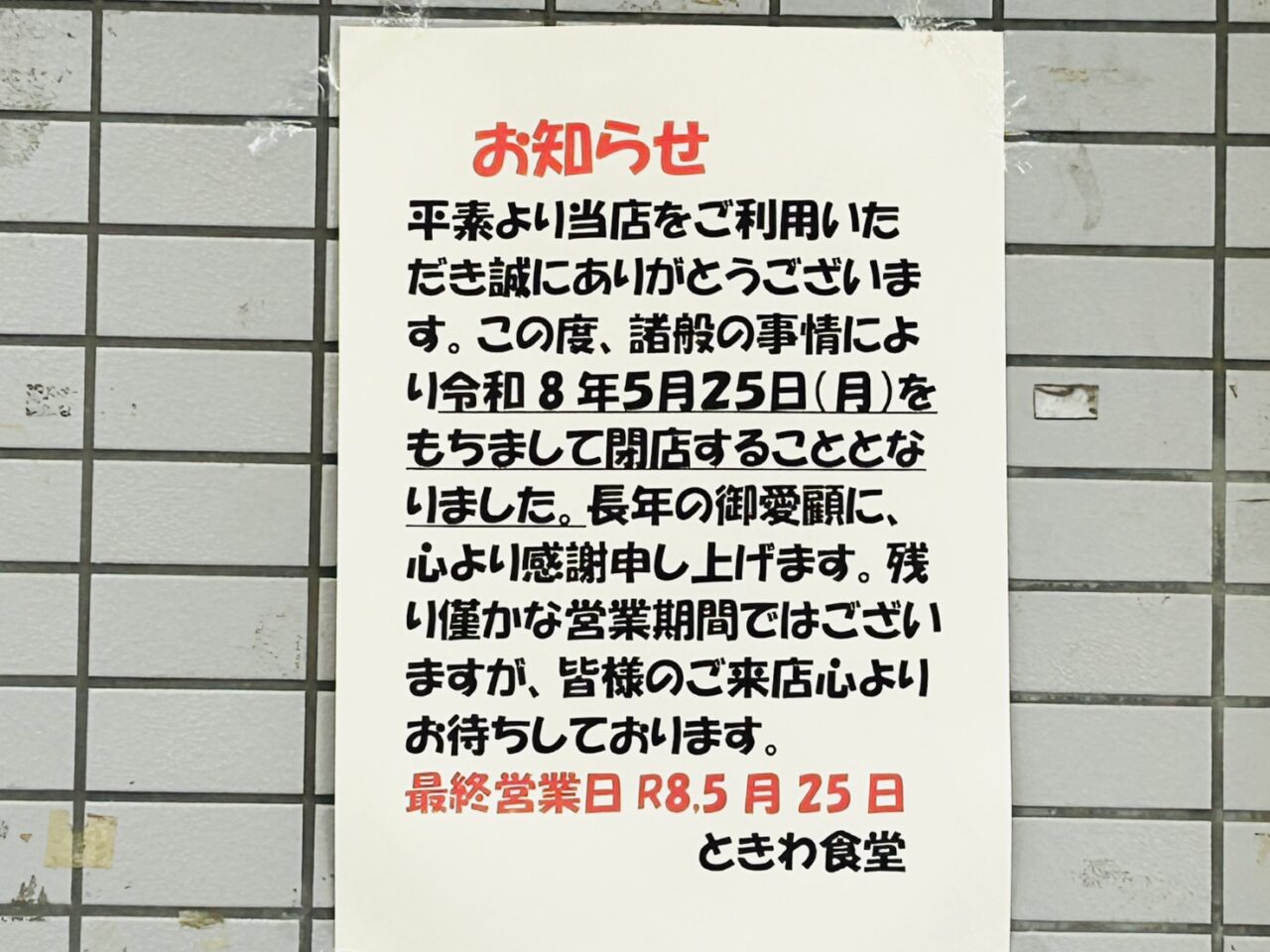東金町「ときわ食堂」店頭に閉店のお知らせ